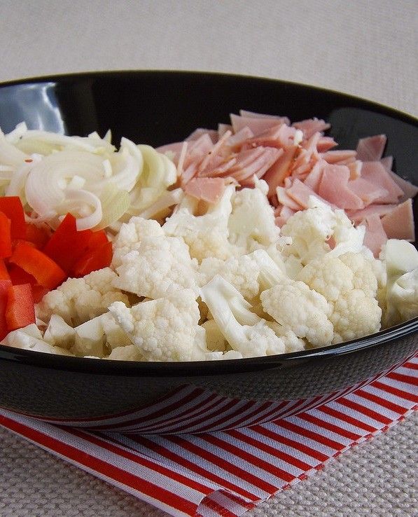 Ta proga, mišrainė su šviežiais žiediniais kopūstais. Dar iš studentavimo laikų... Labai ją kažkada mėgau.