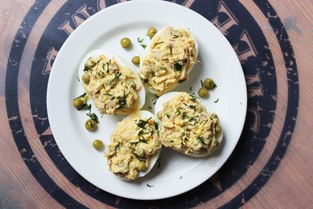 * Į dubenėlį sudedame trynius, konservuotą tuną, majonezą, suberiame krapus ir viską sutriname, gerai išmaišome.* Į gautą masę suberiame žirnelius, lengvai permaišome.