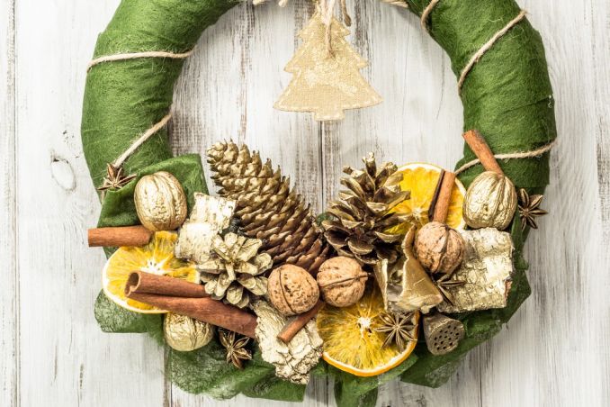 * Šventinės nuotaikos namams suteiks kalėdinis vainikas, pakabintas ant durų. Šis apvyniotas žaliu audeklu ir dekoruotas įprastais kalėdiniais aksesuarais - kankorėžiais, graikiniais riešutais, cinamono lazdelėmis ir džiovintomis apelsinų riekelėmis.