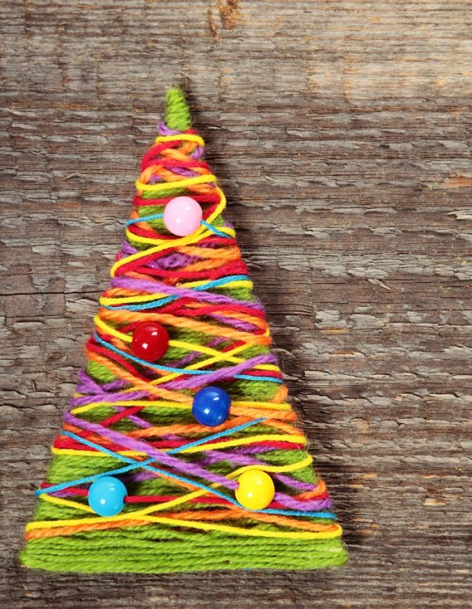 * Mezgėjų eglutė. Žinoma, tikros mezgėjos eglutę gali ir nusimegzti, o šiai tereikia spalvingus siūlus suvynioti ant paruošto pagrindo - kartono. Papuošimui - tiesiog spalvoti karoliai.