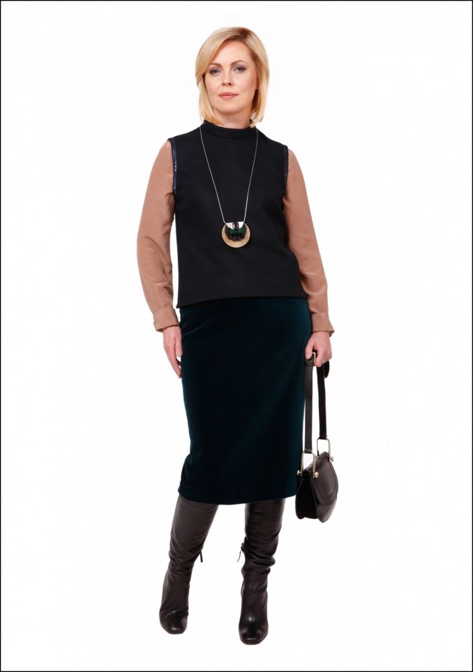 Norint atskleisti moters švelnumą parinkta smėlio spalvos šilkinė palaidinė, vilnonė, tamsiai mėlyna liemenė, dekoruoti blizgiais žvyneliais rankovių kraštai. Pieštuko formos barchatinis sijonas suteikia puošnumo, sijono ilgis pabrėžia moteriškumą. Aksesuaras atskleidžia moters kūrybiškumą. Ilgi aukštakulniai batai vizualiai prailgina kojas. Maža rankinė suteikia patogumo įspūdį.