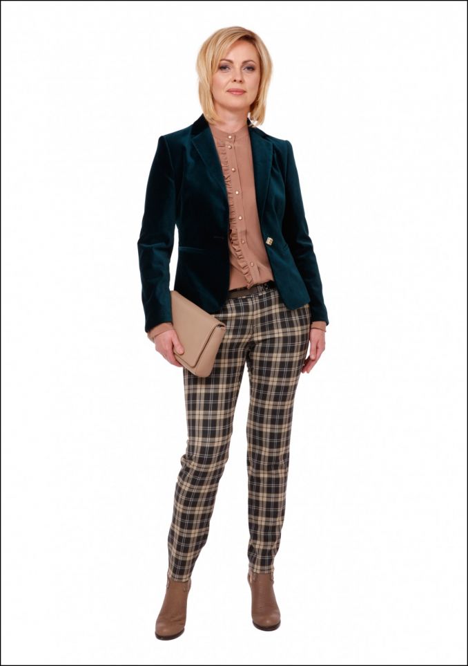Languotos smėlio ir chaki spalvos koledžo stiliaus siauros kelnės pabrėžia dailias moters kojas ir šį įvaizdį daro jaunatviškesnį. Šviesi smėlio spalvos, šilkinė palaidinė, kurios susegimas iš vienos pusės dekoruotas lyg būtų Viktorijos stiliaus žabo, atskleidžia švelnų moteriškumą. Sodrios žalios spalvos barchato švarkas suteikia puošnumo. Smėlio spalvos aukštakulniai ir rankinė atskleidžiama Jūratės elegantiškumą.