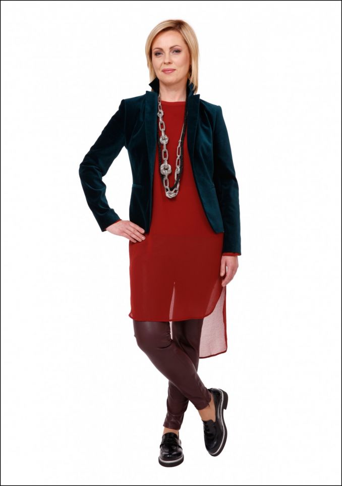 Šį komplektą sudaro dirbtinės odos bordo tamprės (apačioje, vidinėje kojos pusėje su užtrauktuku) ir šiek tiek ryškesnės spalvos šifono audinio palaidinė-tunika, ilgėjanti nugaros dalyje, tai sukuria laisvumo pojūtį. Žalios spalvos barchatinis švarkas pakelta apykakle atskleidžia klientės jaunatviškumą. Masyvūs tamsiai mėlyni batai suteikia laisvės ir nepriklausomybės pojūtį. Šiame komplekte panaudotas sluoksniavimas, kuris aktualus 2016/2017 m. mados tendencijose.
