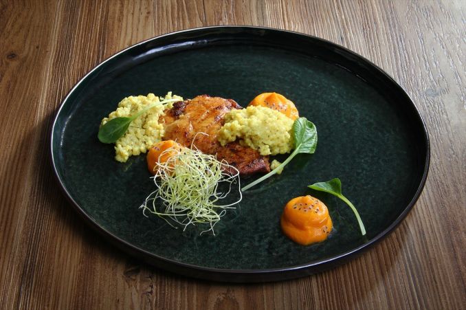 Kitas receptas, kuriuo šefas dalinasi – vištienos šlaunelių mėsa su morkų piurė. Jis juokauja – morkų purė gaminsite ilgiau, nei kad iškeps mėsa, net su marinavimo laiku.