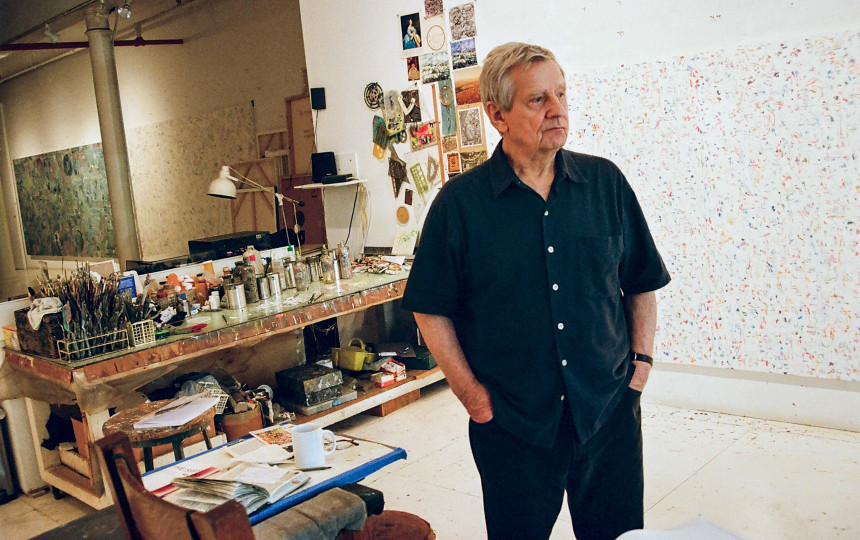 Kol dailininkas kalba, teptukai, žinoma, ilsisi. „Ar galėčiau paprašyti vieno potėpio kadrui?“ – paklausiu imdamas kamerą. „Bet tai turi būti nesuvaidinta, – sako K. Zapkus. – Turi būti realus potėpis naujausiam, nebaigtam darbui.“ Pamirkęs teptuką į dažus, jis kurį laiką ieško tinkamiausio taško. Tada atsargiai palieka paveiksle žymę.