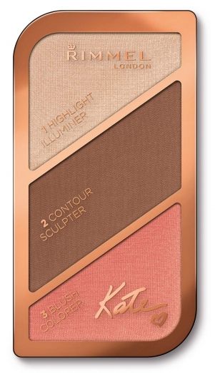 Modeliavimo priemonė ,,Kate“ („Rimmel“) su švytėjimo pasirinktoms veido vietoms (skruostikauliams, smakro viduriui, nosies kuprelei) suteikiančia priemone, matinio atspalvio kontūro priemone ir skaistalais.