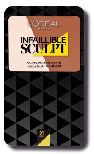 Modeliavimo paletė „Infallible Sculpt“ („L'Oréal Paris“) sudaryta iš dviejų atspalvių priemonių. Išlieka iki 24 valandų.