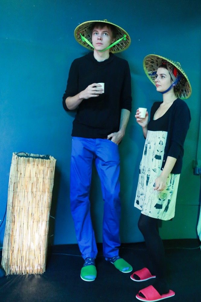Į nuotaikingą vėlyvųjų pusryčių šventę sugužėjo artimiausi “Kaukių akademijos” bičiuliai: režisierius Mykolas Vildžiūnas, balerina Kristina Tarasevičiūtė, renginių organizatorius Aurimas Kamantauskas bei kt. Svečiai buvo prašomi atvykti su namų apranga ir šlepetėmis.