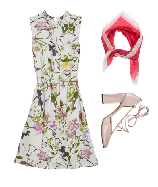 2. Liemenį išryškinančią pastelinių spalvų suknelę pagyvinkite retro stiliaus taškuota skarele.