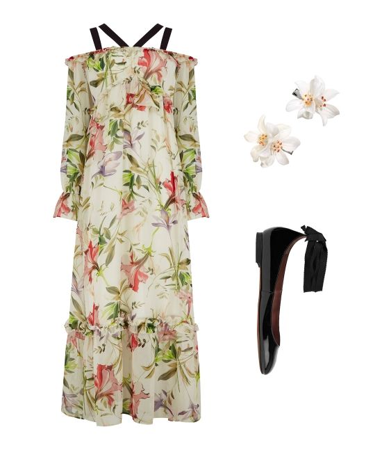 4. Kas sakė, kad gėlėta suknelė turi būti romantiška ir kukli? Viename įvaizdyje derinkite juodos spalvos griežtumą ir gėlų lengvumą.