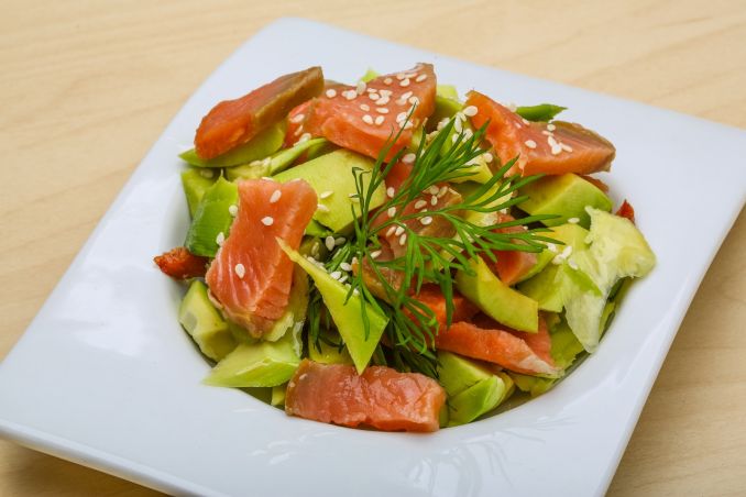 Viduržemio jūros salotos su avokadais ir rūkyta lašiša