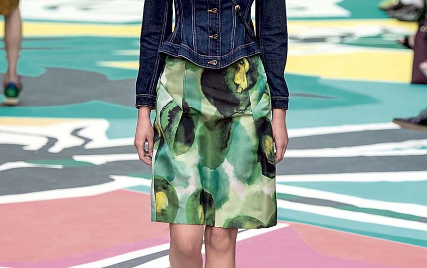 Dailiausiai denimo korta sužaidė mados namų „Burberry Prorsum“ dizaineris Christopheris Bailey’is. Jo pristatytas dideliais blizgiais žvyneliais puošto sijono ir paprasčiausio džinsinio švarko paryškinta liemens linija derinys – tai ir nusilenkimas tradicinei šio audinio funkcijai, ir aliuzija į aukštesnę lygą. Toks komplektas yra puikus kokteilinės aprangos variantas. Genialus sprendimas? Tereikia apatinę švarko siūlę per visą ilgį papuošti avikailiu – taip bus sukurtas iškilesnis siluetas, primenantis mados namų „Dior“ „Bar“ modelius. Ir kas sakė, kad net kasdieniškiausi akcentai negali gimti iš naujo?