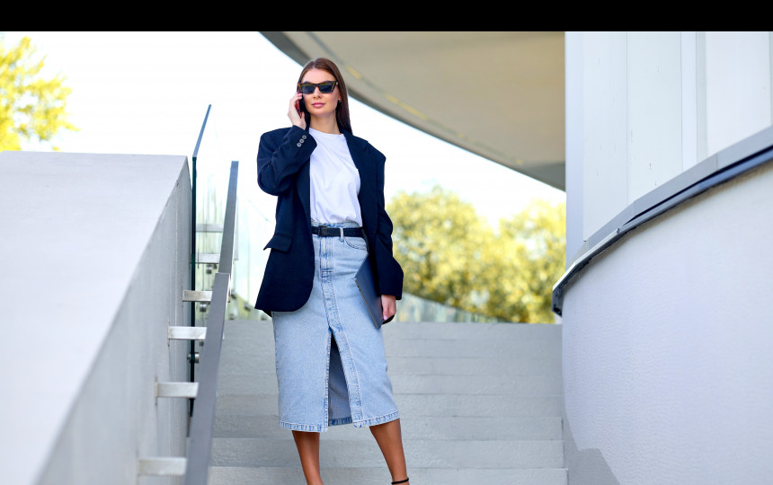 Džinsas gali būti būtent tai, ko trūksta jau kiek pabodusiai jūsų darbo uniformai. Džinsus palikite savaitgaliui, o štai elegantiško silueto džinsinis sijonas biuro aplinkoje atrodys itin stilingai. Tik nesirinkite plėšyto ar dekoruoto džinso sijono, nebent jūsų darbo aplinka – itin liberali.
