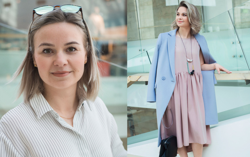 Kadangi savo įvaizdyje Asta troško pavasarnio vėjo, jai parinkome pastelinių tonų komplektą. Moters plaukai dažyti šalto atspalvio spalva, tad jai puikiai tiko švelniai rožinės suknelės ir levandų spalvos palto derinys. Žaismingumo suteikė vienas ant kito sluoksniuoti originalūs vėriniai. Eidama į darbą dažniausiai Asta renkasi marškinius ir pieštuko formos sijonus, bet profesinė apranga neprivalo būti varžanti. Darbo garderobo dalimi gali tapti ir laisva suknelė, svarbiausia jai struktūros suteikti kitais elementais (švarku, liemene, paltu ir pan.).