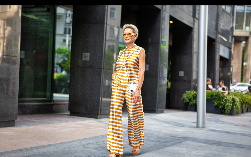 Klasikinių mėlynų džinsų ir smėlio spalvos palto derinys tampa tobulu neutraliu pagrindu, leidžiančiu sužibėti vaiskioms oranžinei ir violetinei.