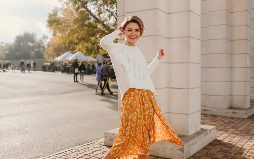 Rudenį vasarinę suknelę galma dėvėti kiek kitaip (priklausomai nuo oro). Paprasčiausias būdas – midi ar maxi suknelę paversti sijonu. Tai paprasta: tiesiog užsimeskite laisvą megztinį, kurio ilgis sieka maždaug klubus. Kasdieniam įvaizdžiui tiks labai laisvas megztinis. Jei siekiate elegantiškesnio įvaizdžio, pasirinkite siaurėjančio kirpimo modelį, o jo apačią užlenkę į vidų subtiliai išryškinsite liemenį. Galite pridėti ir diržą.