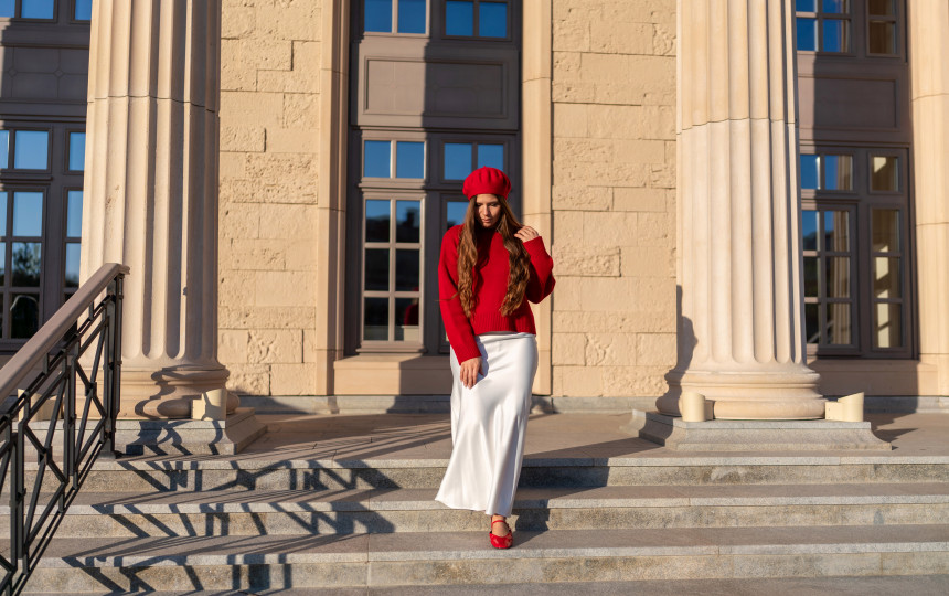 Vienspalvis įvaizdis visada atrodo nepriekaištingai. Kreminis satino sijonas, derinamas su minkštu megztiniu ir smėlio spalvos aukštakulniais, sukuria subtilų, elegantišką efektą. Skirtingų medžiagų derinys – švelnaus kašmyro ir žvilgančio satino – suteikia prabangos pojūtį, o kartu neleidžia įvaizdžiui atrodyti pernelyg klasikiškai. Tokia spalvinė dermė puikiai tinka tiek kasdienai, tiek vakarui, todėl šį derinį galima rinktis beveik bet kokiai progai.