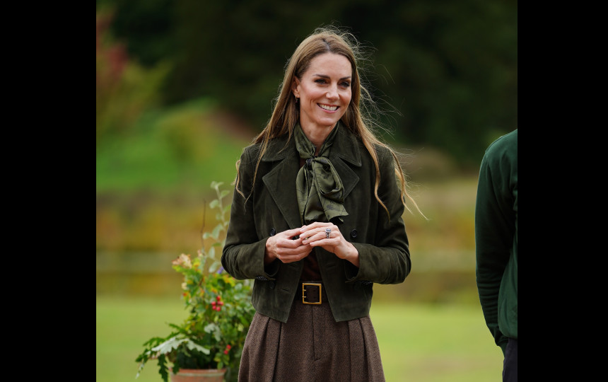 Velso princesė neseniai pasirodė su viena karščiausių šio rudens striukių tendencijų iš „Me+Em“ – dar kartą įrodydama, kad geba derinti tradiciją ir mados naujoves. Šis ansamblis taip pat puikiai atskleidžia, kaip Kate jungia tradicinį britišką stilių su šiuolaikiška elegancija. Ji renkasi tamsiai žalią, dvieilį švarką iš standesnio audinio, kurį derina su rudai atspalvio midi ilgio vilnoniu sijonu. Romantiška palaidinė su kaspinu prie kaklo suteikia subtilaus moteriškumo, o aukštakulniai auliniai batai užbaigia visą derinį. Tai įvaizdis, tinkantis tiek oficialiam renginiui, tiek jaukiam rudens pasivaikščiojimui, o žemiškų spalvų paletė idealiai atspindi rudens nuotaiką.