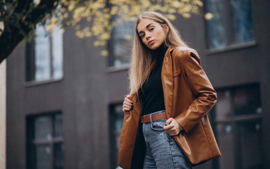 3. Ilgas odinis švarkas – džinsų geriausias partneris