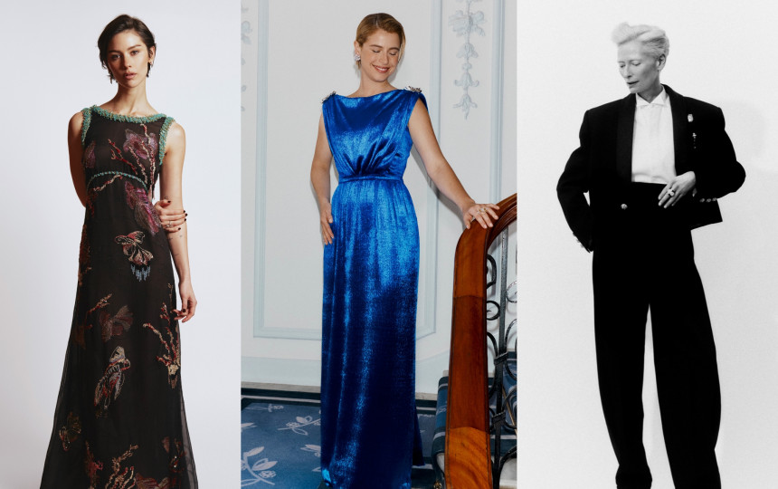 Aktorė Tilda Swinton BAFTA apdovanojimams pasirinko elegantišką juodo tvilo smokingą. Kostiumą papildė perlų sagomis dekoruoti balti marškiniai, segės ir dvispalviai bateliai. Šis įvaizdis pristatytas mados namų „Chanel“ 2026 m. „Métiers d’art“ kolekcijoje.