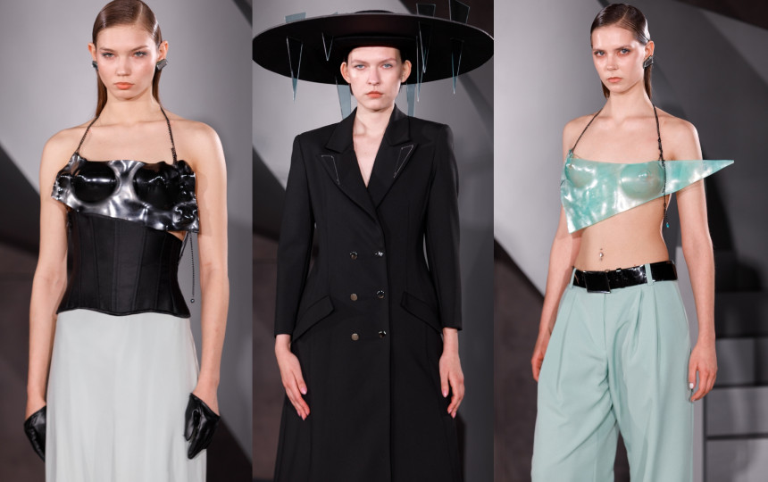 Stiklo detalės tapo išskirtinėmis puošmenomis – nuo dekoro detalių iki aksesuarų. Kolekcijoje panaudoti seni langų stiklai, perdirbtas stiklas pritaikytas struktūriškiems korsetams bei aksesuarams, stiklo šukėmis dekoruotos kokteilinės suknelės, klasikinio stiliaus švarkai ir kepurės, o stiklo skulptūros tapo unikaliais papuošalais. Vienas įspūdingiausių įvaizdžių – plačiakraštė juoda skrybėlė, perdurta aštriomis stiklo šukėmis.