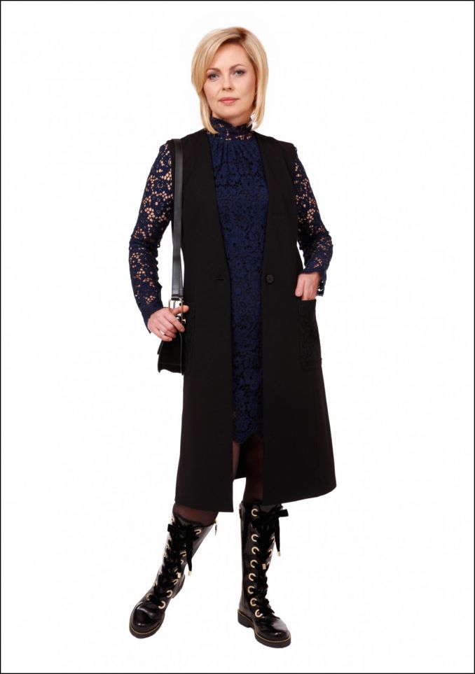 Norint atskleisti moters švelnumą parinkta smėlio spalvos šilkinė palaidinė, vilnonė, tamsiai mėlyna liemenė, dekoruoti blizgiais žvyneliais rankovių kraštai. Pieštuko formos barchatinis sijonas suteikia puošnumo, sijono ilgis pabrėžia moteriškumą. Aksesuaras atskleidžia moters kūrybiškumą. Ilgi aukštakulniai batai vizualiai prailgina kojas. Maža rankinė suteikia patogumo įspūdį.