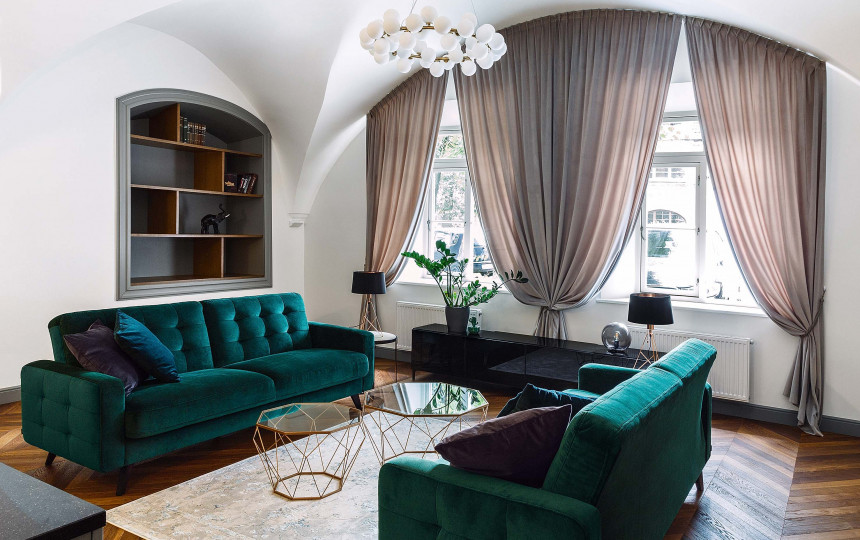 Jei kadaise čia gyvenusioms benediktinėms būtų lemta atsidurti šiame būste, jas ištiktų deja vu: lyg ir matyta, bet nauja. Čia gyvenančiai porai ir interjero kūrėjai svarbiausia buvo išsaugoti tai, kas sena, ir suteikti šiuolaikiškumo. Pagarba istorijai atiduota išsaugant XVII–XVIII a. planinę būsto struktūrą, autentiškas keraminių plytelių grindis ir įspūdingus skliautus. Arkiniai skliautai – įspūdingiausias ir išskirtiniausias šio interjero bruožas, o savitumo suteikia klasikiniai ir modernūs elementai.