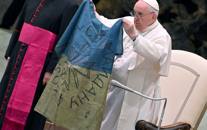 Po to 85 metų Pranciškus atsistojo ir iškėlė vėliavą, kuri, pasak jo, „atkeliavo iš karo. Iš to kankinių miesto Bučos“. Tada jis sulankstė vėliavą ir pabučiavo ją.