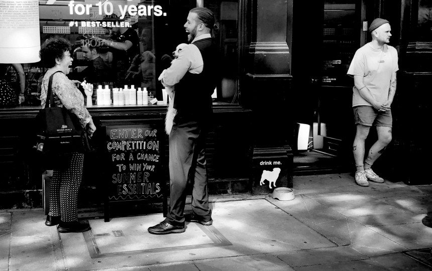 Mobiliuoju telefonu „iPhone“ rekordiškai karštą 2019-ųjų birželį darytoje nuotraukoje „Malonus pokalbis“ įamžintas gatvės gyvenimas Kovent Gardene, Londone.