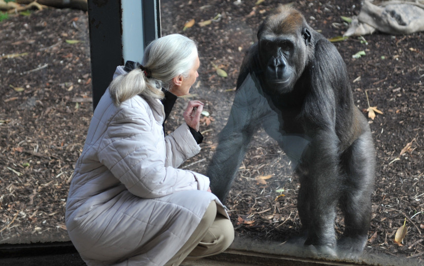 Paskutiniame vaizdo įraše, paskelbtame prieš mirtį, J. Goodall, apsirengusi savo firminiu žaliu drabužiu, kalbėjo klausytojams: „Kai kurie iš mūsų galėtų pasakyti „Bonjour“, kai kurie iš mūsų galėtų pasakyti „Guten Morgen“ ir t. t., o aš galiu pasakyti: „Hoo-hoo-hoo-hoo-hoo-hoo-hoo-hoo-hoo! Tai reiškia „Labas rytas“ šimpanzių kalba.“