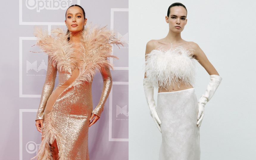 K. Meschino vilkėta auksinė suknelė – naujausių vestuvinės mados tendencijų atspindys. 2026 m. populiarėja nuotakų suknelės, puoštos plunksnomis. Jomis gali būti dekoruojama ne tik apykaklė ar iškirptė, bet ir visas apačios kraštas.