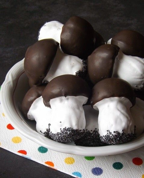 9. Merkite grybukų kepurėles į šokoladą, vėl statykite į kepimo skardą su ryžiais, kad nudžiūtų.