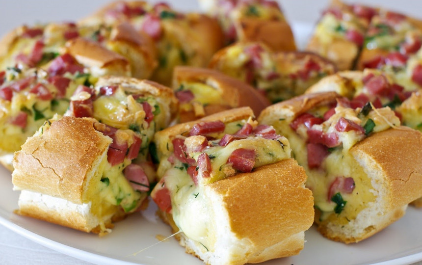 Imkite prancūzišką batoną ir įpjaukite įpjaukite viršų, palikdami "bortelius", išimkite minkštimą šiek tiek jo palikdami. Sudėkite paruoštą įdarą.