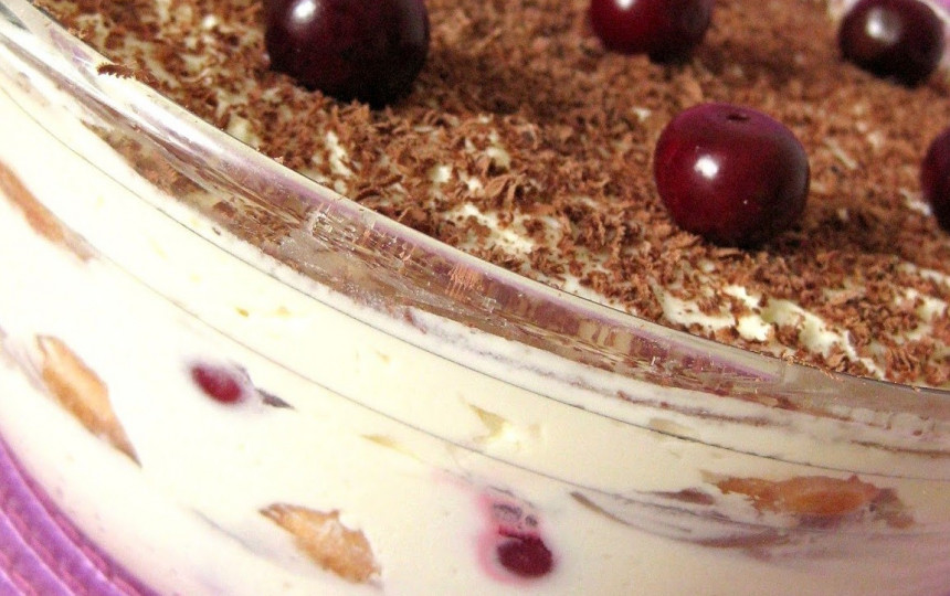 Grietinėlę išplakame su cukrumi ir citrinos rūgštimi. Sudedame maskarponę ir nedideliu greičiu viską kartu išplakame iki vientisos masės. Imame stiklinį indą norimos formos, labai trumpam panardiname sausainius (po vieną) į kavą ir sudedame viena eile ant dugno, užpilame kremo, dedame vyšnių (jas įspaudžiame į kremą). Vėl dedame sausainius, suvilgytus kava, toliau - kremas, vyšnios ir t.t. Viršutinis sluoksnis turi būti kremo. Viršų galima pabarstyti tarkuotu šokoladu arba kakava. Palaikome kelias valandas šaldytuve. Skanaus!