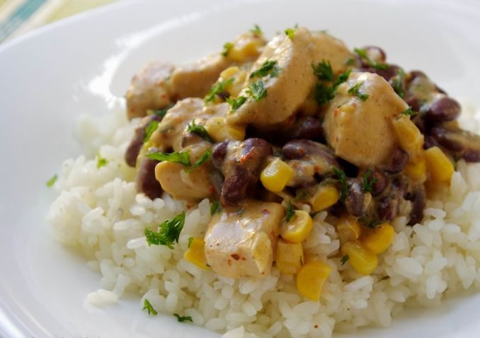 4. Tada supilkite grietinėlę ar grietinę sumaišytą su krakmolu ir pakaitinkite kelias minutes. Patiekite su ryžiais.