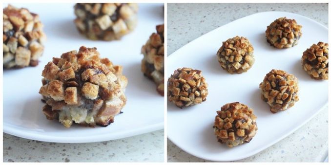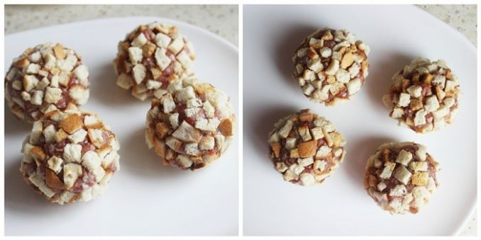 * Formuojame rutuliukus ir apdedame/apspaudžiame džiovintais batono kubeliais, kad šie tvirtai laikytųsi.