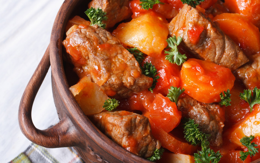 * Morkas nuskusti, nuplauti ir supjaustyti kubeliais ir suberti į svogūnus. Ten pat sudėti ir supjaustytą jautieną, supilti balzaminį actą ir maišant kepti dar maždaug 10-15 minučių.