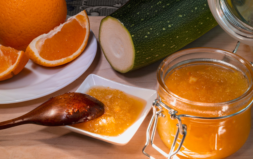 * Cukinijas ir apelsinus užpilkite cukrumi ir palikite per naktį šaltai.