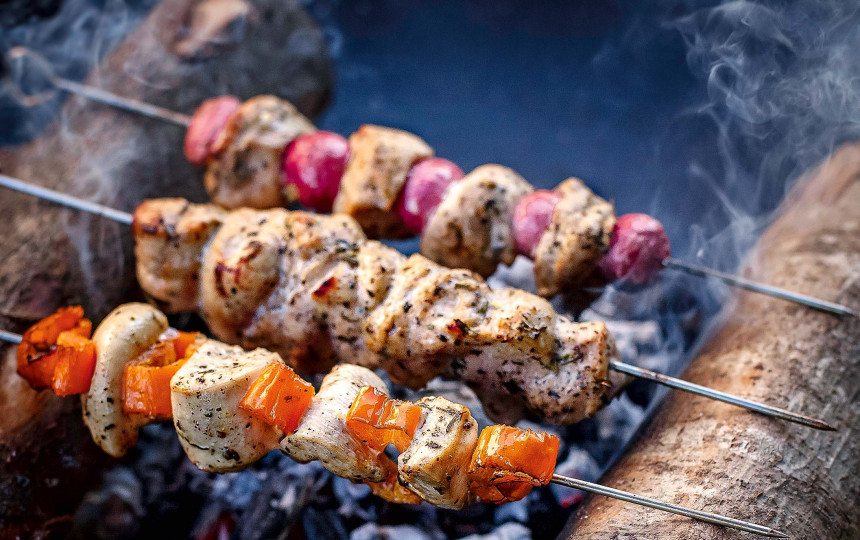 Mėsą suverkite ant iešmų (nepalikdami tarpų) pramaišiui su paprikos gabaliukais bei ridikėliais, pabarstykite druska ir kepkite virš žarijų. Kai iškeps, ragaukite su žalumynais ir likusiais ridikėliais.