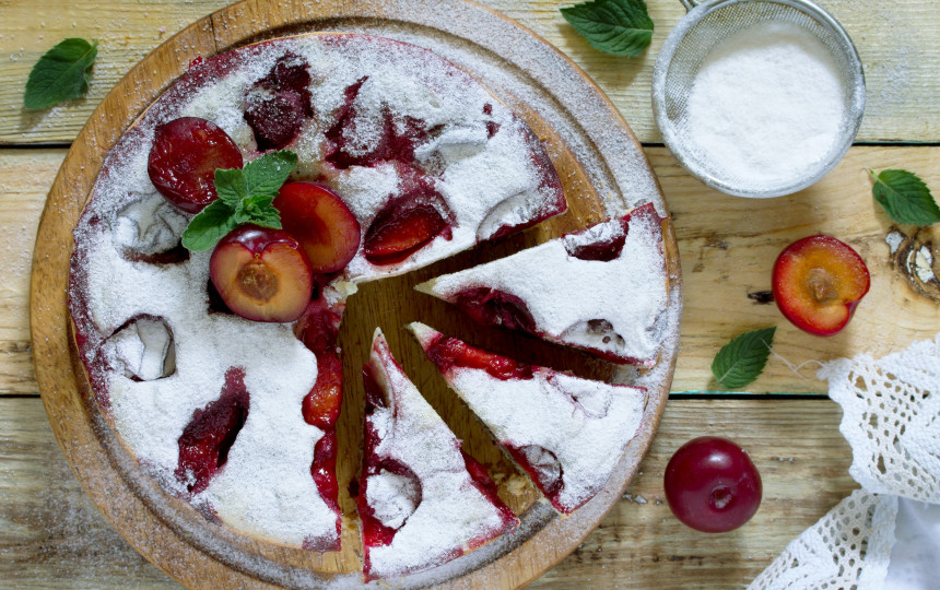 * Tešlą nestorai išpilkite į sviestiniu popieriumi išklotą skardą. Slyvų puseles sudėkite ant tešlos. Kepkite 160 laipsnių orkaitėje apie 40-50 min.