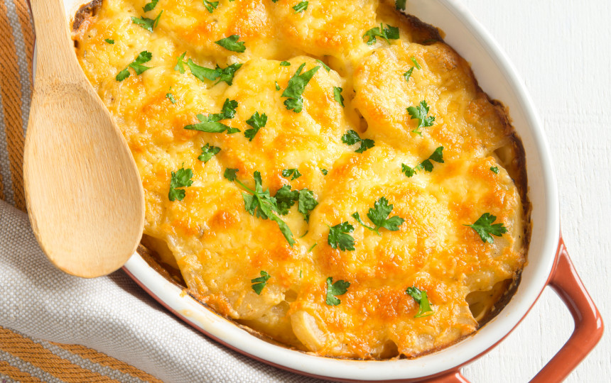 - Bulves gerai nušveiskite šepetėliu po tekančiu vandeniu, su lupenomis iškepkite orkaitėje taip, kad būtų dar kietokos. Atvėsinkite, nulupkite ir supjaustykite griežinėliais.
