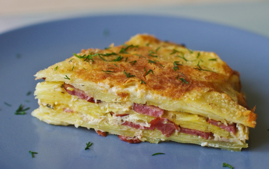 - Kepimo formą išklokite kepimo popieriumi. Dėkite sluoksnį bulvių, tuomet keptos antienos, vėl - bulves, vėl - antieną ir viršutinį sluoksnį vėl apdėliokite bulvėmis.