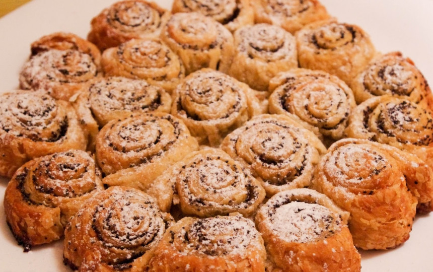 3. Patepkite ~1,5 v.š. lydytu sviestu, pabarstykite pagal skonį cukraus ir aguonų. Susukite į volelį ir supjaustykite norimo dydžio ritinėliais.