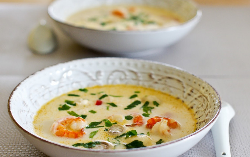 - Supilkite kokosų pieną, sudėkite krevetes, pagardinkite druska, išmaišykite ir kai užvirs, pavirkite 3-4 min., t.y., kad krevetės taptų raudonos ir būtų išvirusios.