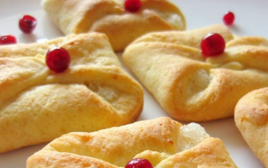 * Iškočiojame apie 2-3 mm. storio lakštą ir supjaustome 8 x 8 cm. kvadratėliais. Ant kiekvieno į vidurį beriame 1 а. š. cukraus. Imame priešais esančius kvadratėlio galus ir lenkiame į vidurį - gerai suspaudžiame vieną su kitu, nes kepdami sausainiai linkę "išsiskleisti". Dedame ant kepimo popieriaus nelabai arti vienas kito, nes kepdami kyla ir plečiasi. Kepame iki 180 C įkaitintoje orkaitėje 20 min., kol gražiai pagelsta. Skanaus!