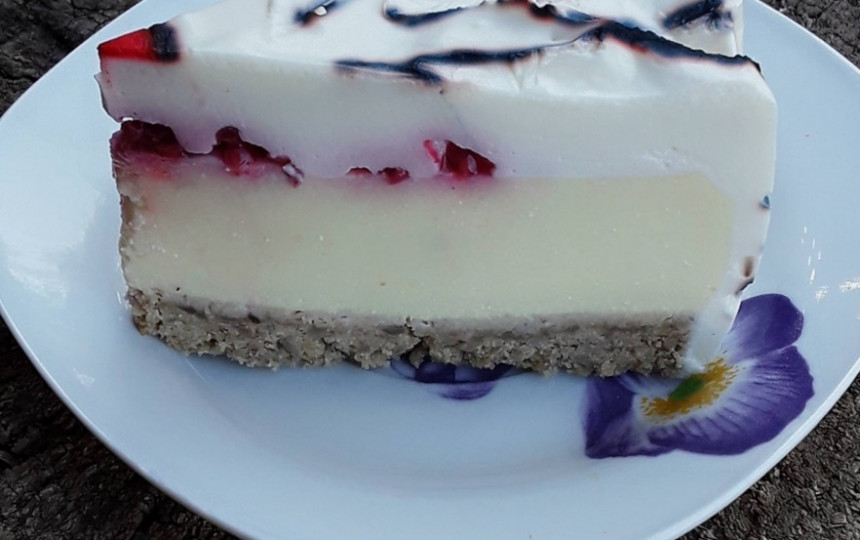 Trupintų sausainių ir saulėgrąžų pagrindas, citrinų skonio, mėtų aromato varškės kremas apgaubtas baltojo šokolado jogurtiniais putėsiais su avietėmis – toks šis gražuolis. Puošyba – naujausias mados klyksmas, taip pat mano kūrinys.