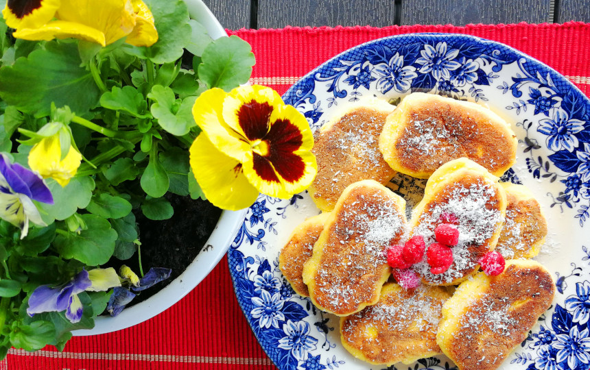 - Drėgną ir sausą mases sumaišykite iki vientisos masė. Tešla bus gana skysta, todėl varškėtukus formuokite drėgnomis rankomis, apvalkiokite kukurūzų miltuose ir dėkite kepti į įkaitintą keptuvę su išlydytu sviestu.