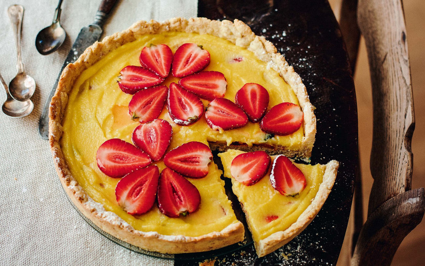Tešla. Į dubenį sutarkuokite šaltą sviestą, suberkite miltus, cukrų, druską, įpilkite vanilės ekstraktą, įdėkite trynius ir viską suminkykite į kamuolį. Tešlą iškočiokite, įklokite į maždaug 20 cm skersmens kepimo formą ir subadykite šakute, kad neiškiltų „pagalvių“. Kepkite 180 °C orkaitėje 25–30 min. Iškeptą palikite atvėsti.