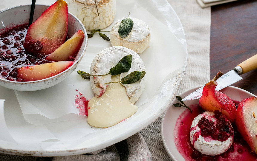 Sūrius sudėkite į kepimo popieriumi išklotą skardą ir kepkite 200 °C orkaitėje maždaug 15 min., kol jie išsipūs. Likus kepti 5 min., šalia sūrių sudėkite tirpintame svieste pamirkytus šalavijų lapelius. Iškeptus sūrius ir šalavijus perkelkite į lėkštes, ragaukite su spanguolių pagardu ir kriaušėmis.