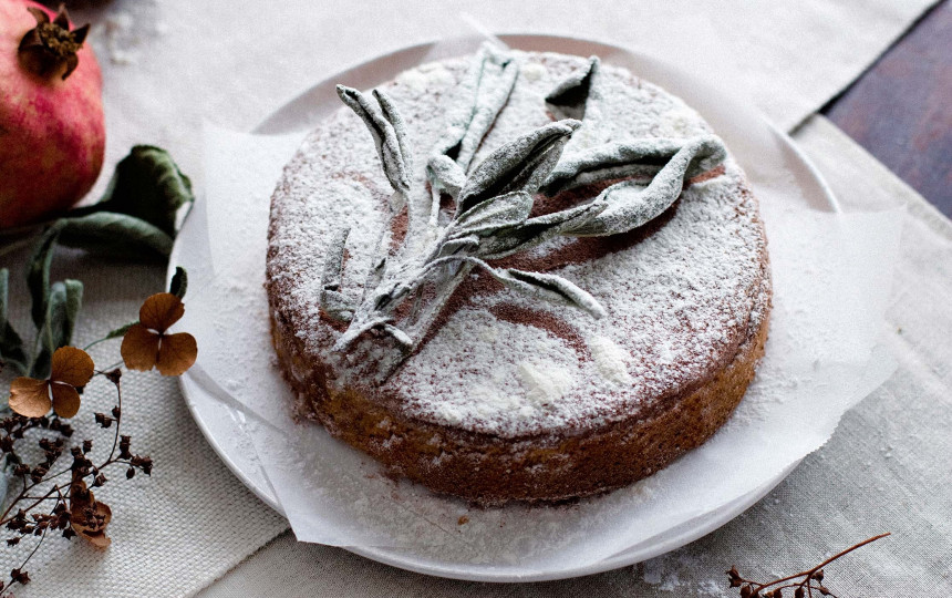 * Atvėsusį meduolį išimkite iš formos. Uždėkite šalavijų šakeles ir užberkite miltelinį cukrų. Vietoj šalavijų galima naudoti, pvz., hortenzijų žiedus, paparčius, žvaigždanyžius.